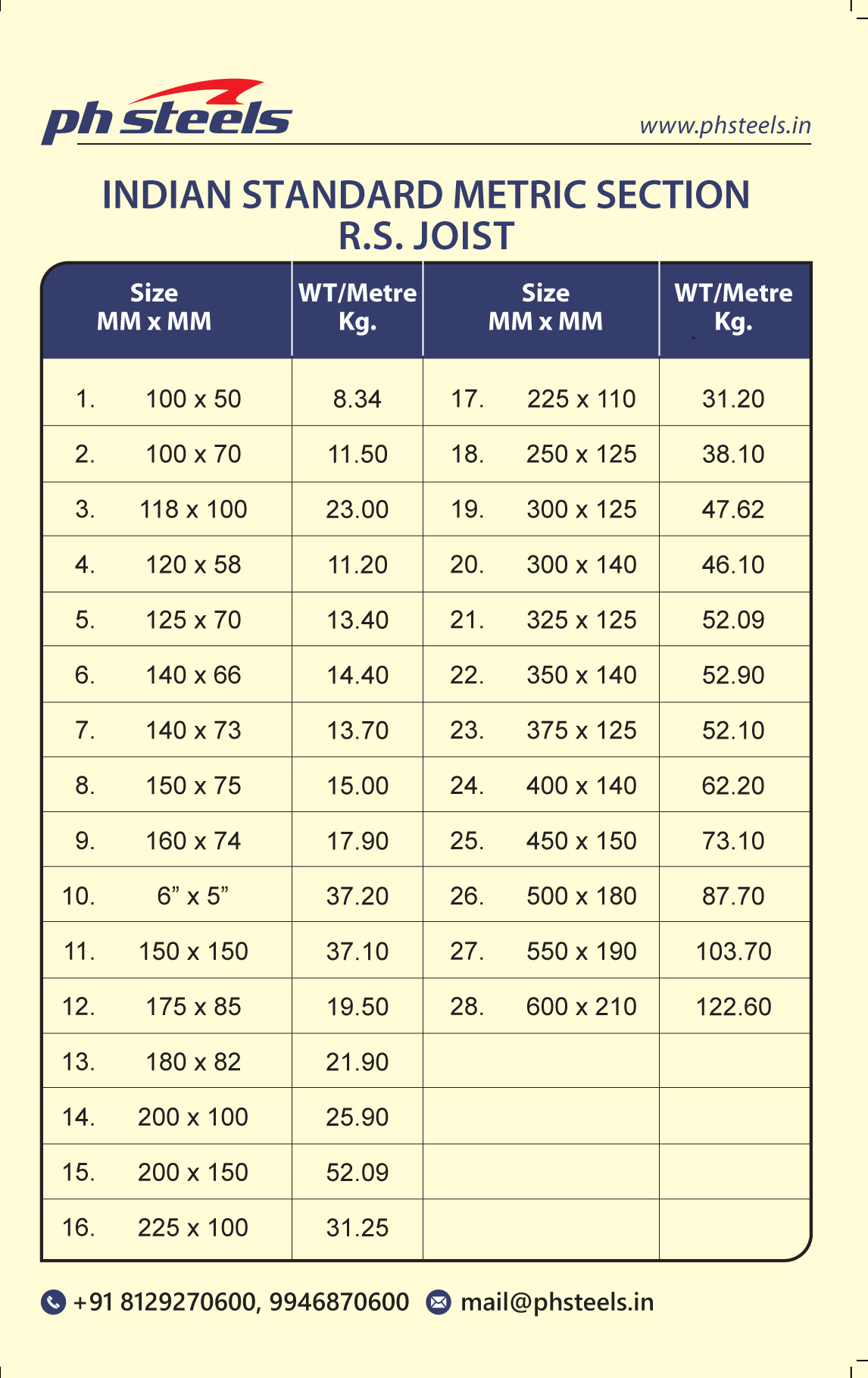 At PH Steels, we supply MS Joists in a wide range of sizes (100mm to 600mm and above), with consistent dimensional accuracy, high yield strength, and perfect surface finish—ready to meet the demands of your project.